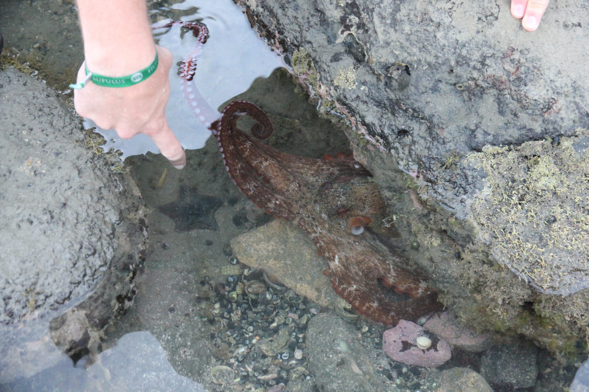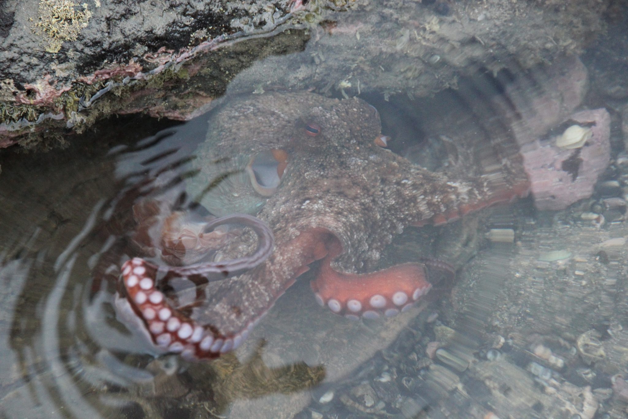 An der Goat Island angekommen ging es dann Nachmittags noch zum Schnorcheln ins Wasser. Dabei konnten wir schon mal ein paar Fische sehen, ohne Wetsuit wurde es nach gut 20 Minuten dann aber doch zu kalt. Für die Nacht haben wir uns einen tollen Platz am Strand gesucht und bei einer schönen Strandwanderung sogar Oktopusse gefunden, die sich in Wasserpools versteckt und auf die nächste Flut gewartet haben. Die haben sogar mit uns ‘gespielt’ und nach unseren Fingern gegriffen! Wir haben dann Meeresschnecken gesucht, geknackt und verfüttert. Die Oktopusse haben sich auf jeden Fall gefreut 🙂 Die übrig gebliebenen Schneckenreste haben noch Shrimps und Krebse angelockt.