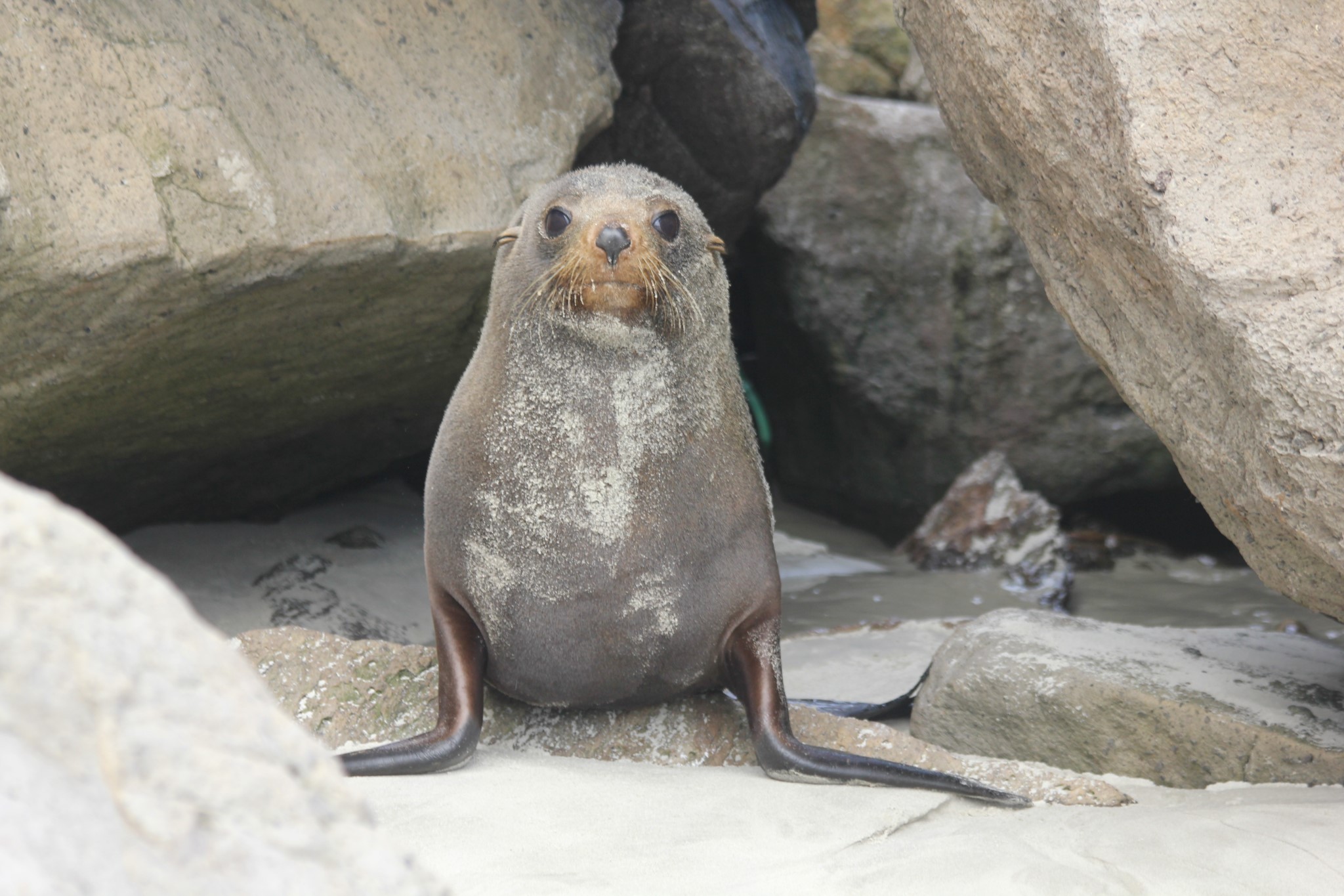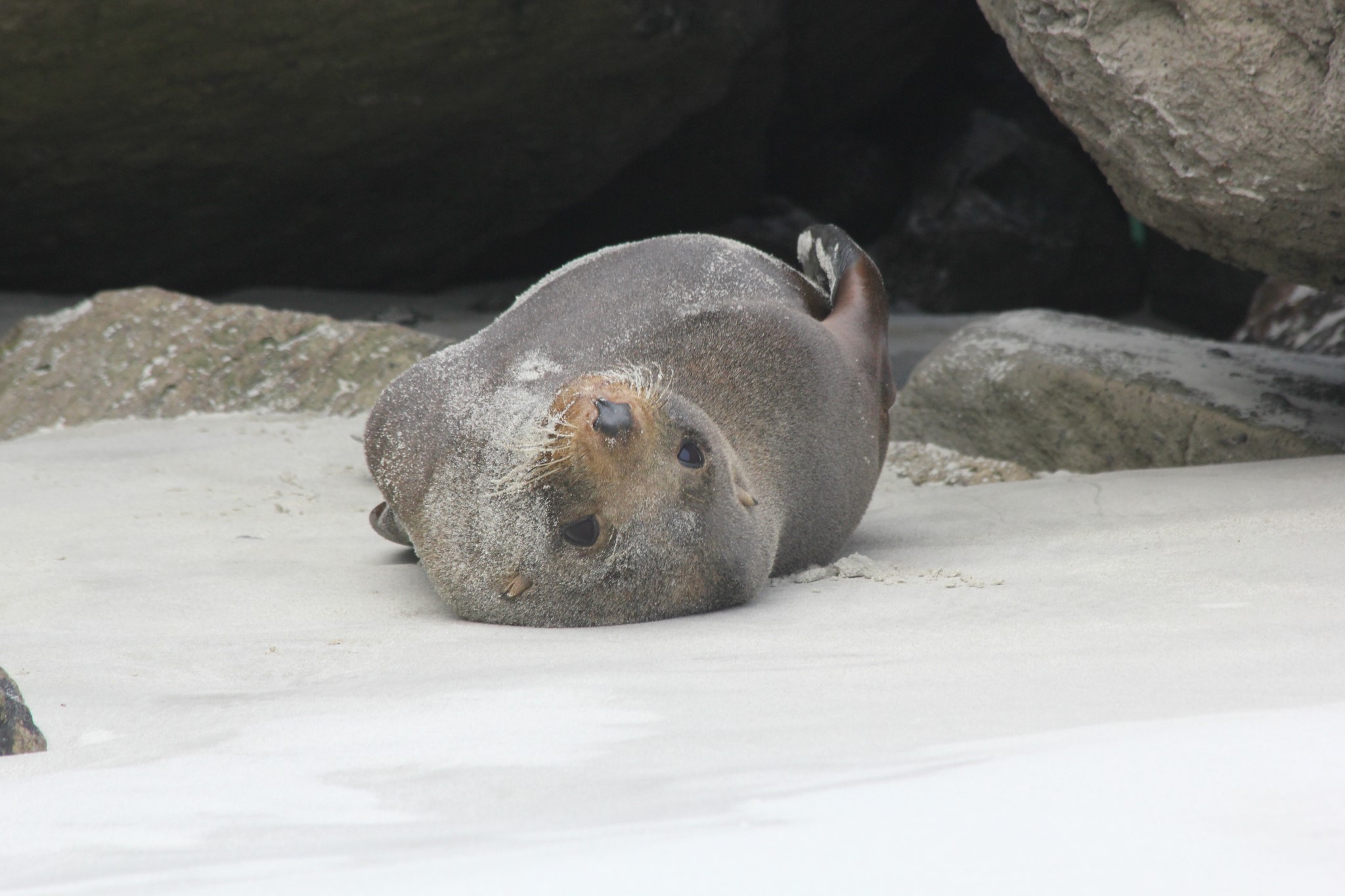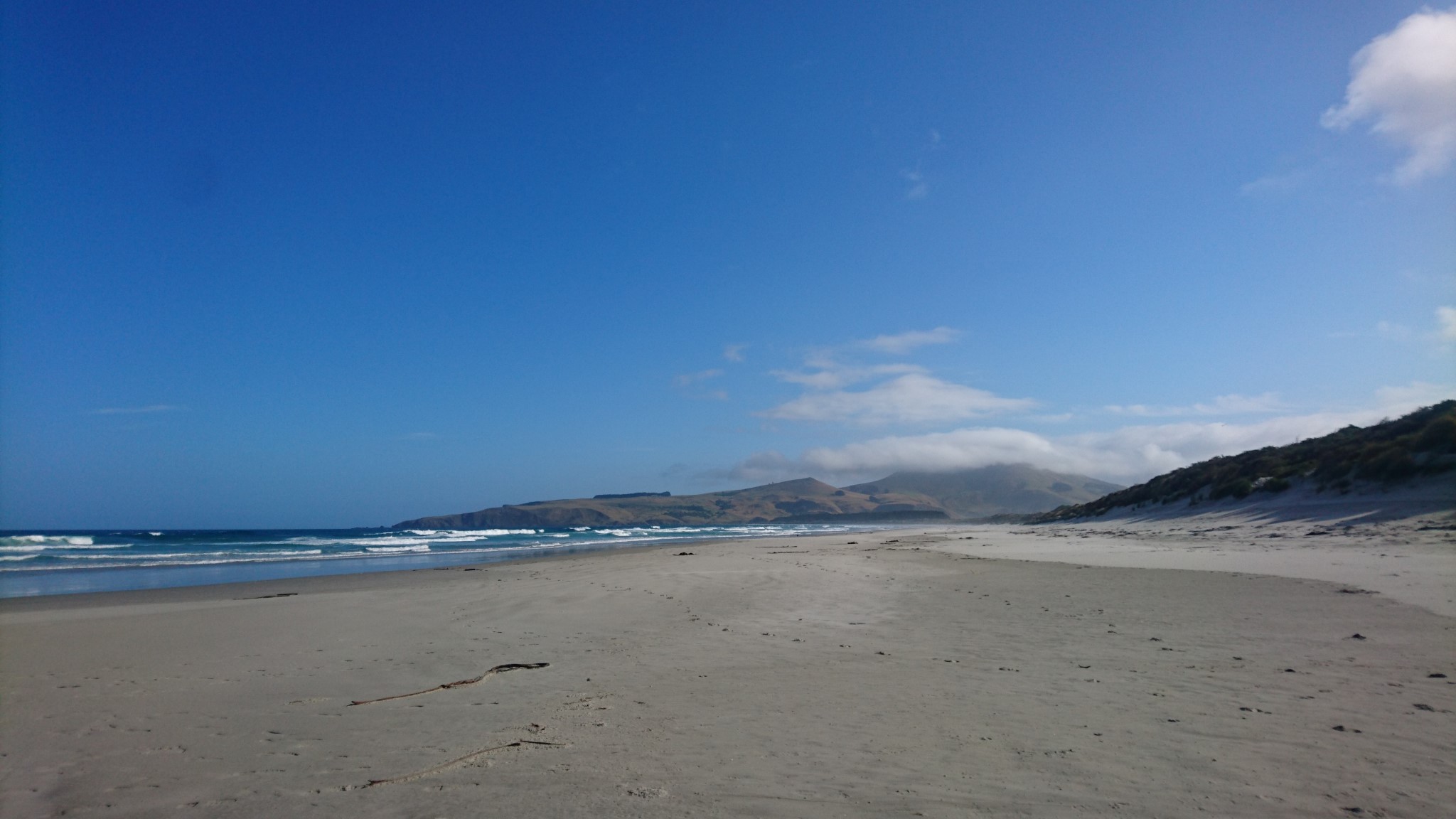 Ein weiteres Highlight war eine Strandwanderung im Okia Beach Reserve, auch auf der Otago Peninsula. An dem einsamen Strand wären wir fast über eine schlafende Robbe (Fur Seal) gestolpert. Man bemerkt diese faulenzenden Fellwürste nämlich manchmal gar nicht, besonders wenn sie im Schatten zwischen den Felsen liegen. Wir haben uns mindestens genauso erschrocken wie er, da hat der süße Fellknäuel schon versucht uns zu verscheuchen und ist leicht fauchend auf uns zu gerobbt. Wir haben uns einige Meter in die Flucht schlagen lassen und ihn dann aus 10-15m Entfernung beobachtet. Damit war er sichtlich zufrieden und hat es sich sofort wieder gemütlich gemacht 🙂