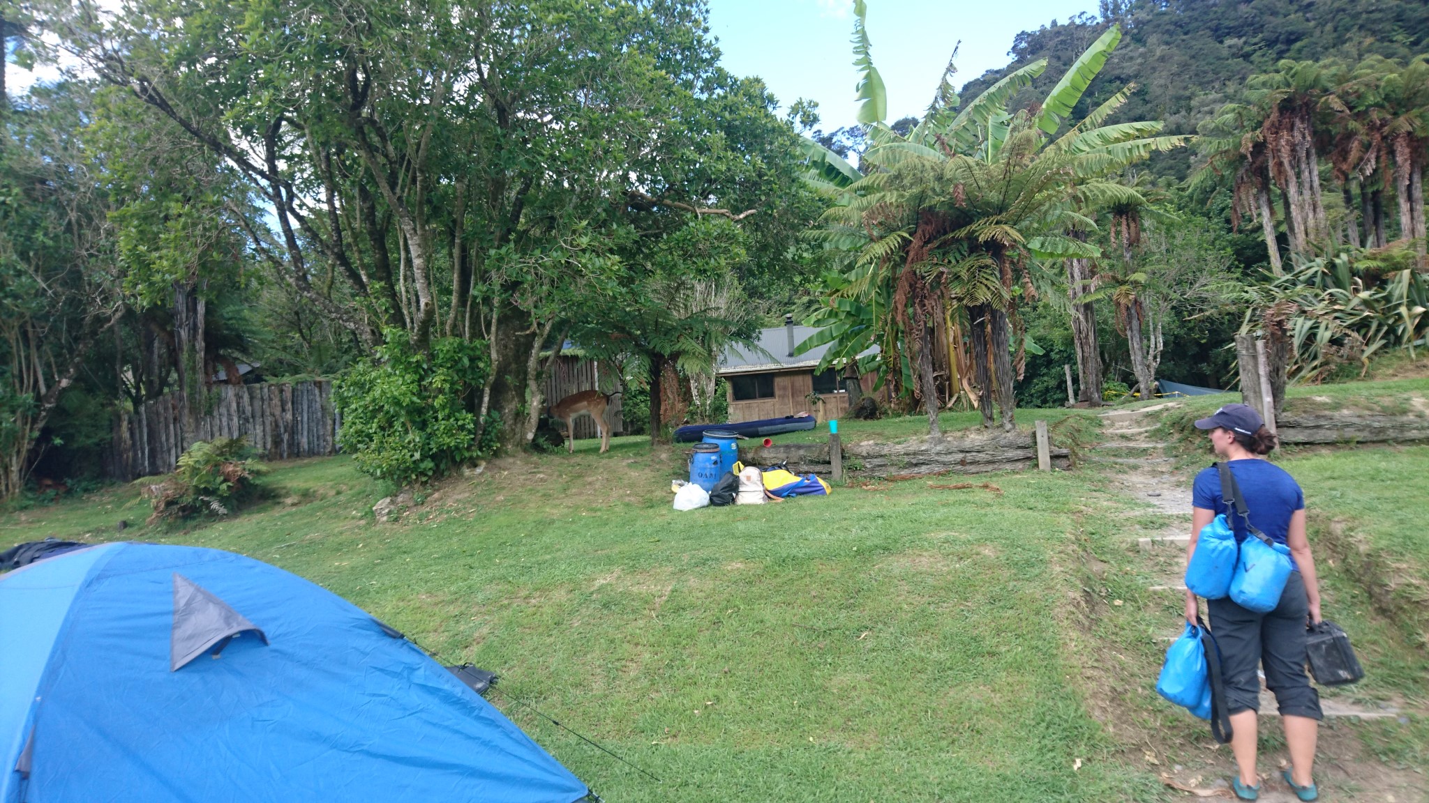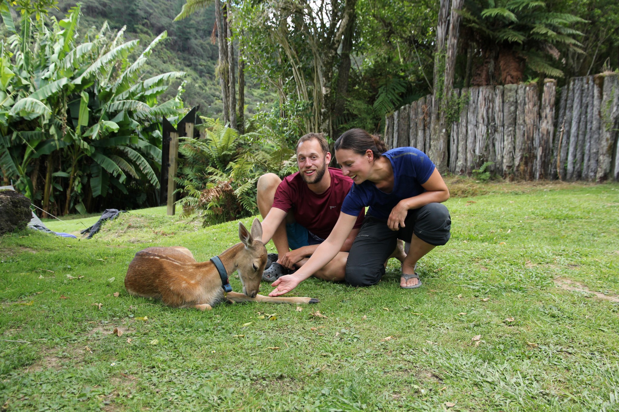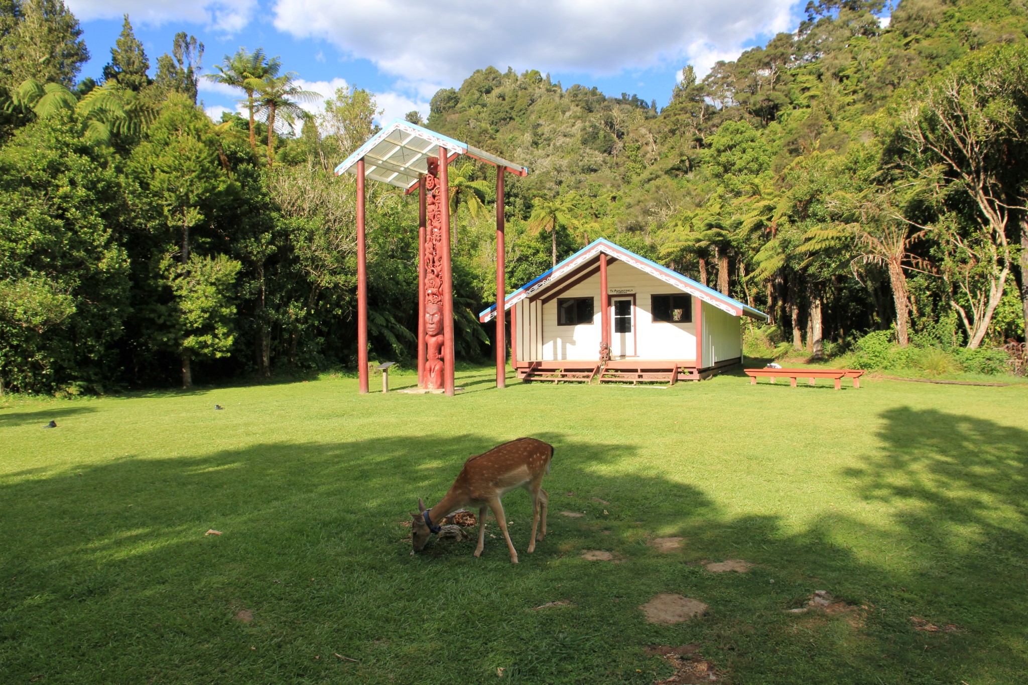 Ein Highlight war die zweite Nacht in der Tieke Kāinga Hütte. Die Hütte steht in einer alten Maori Siedlung mit einem malerischen “Meeting House” der Gemeinde. An dem Tag waren leider keine Maoris dort, dafür konnten wir aber Bekanntschaft mit dem zahmen (und verfressenen) Haus-Reh machen.
