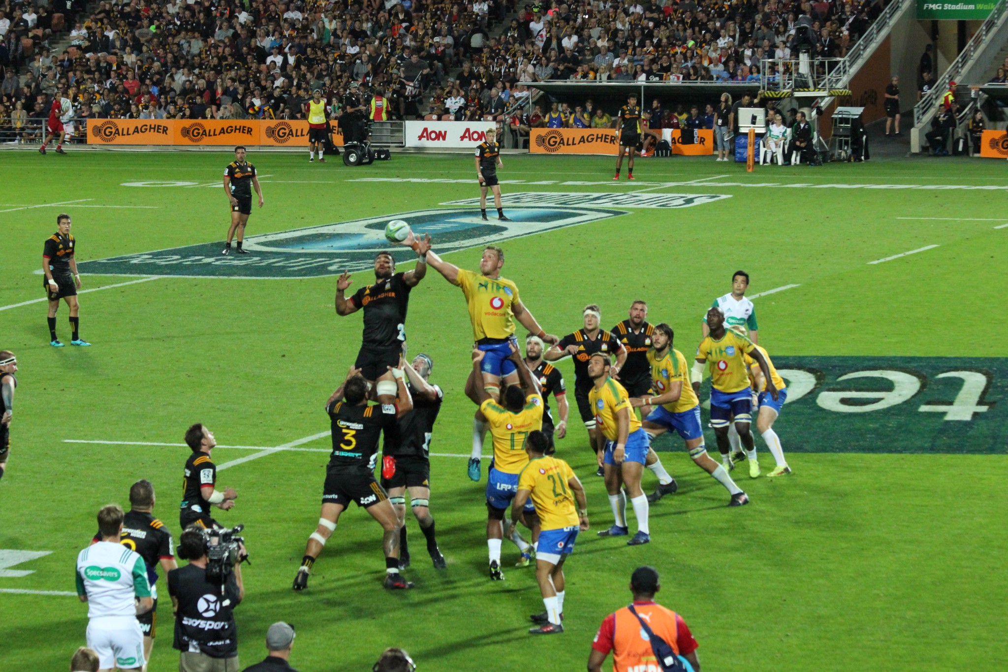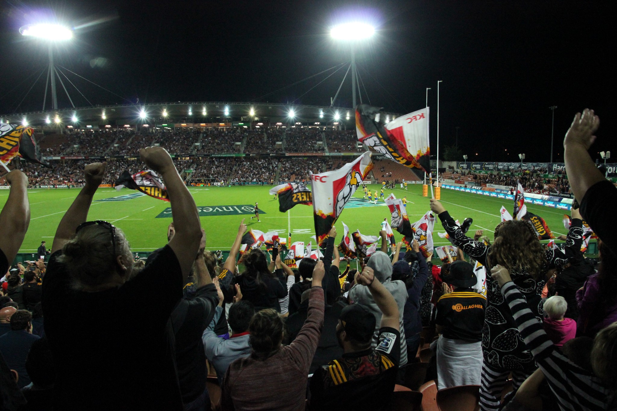 Nun haben wir uns ein richtiges Rugby Spiel im Stadion in Hamilton angesehen. Dort haben wir wieder Laura und Tobi getroffen, die mit ihrer NZ-Rundreise nun fast fertig waren. Tobi spielt selbst Rugby in Deutschland und hat sein Bestes gegeben uns die Regeln zu erklären. Ich habe weniger als die Hälfte verstanden. Gespielt haben die Hamilton Chiefs (NZ) gegen die Pretoria Bulls (Südafrika). Zuerst sah es für die Neuseeländer gar nicht so gut aus, doch in der zweiten Halbzeit haben sie die Südafrikaner dominiert und das Spiel für sich entschieden. Die Stimmung war großartig! In der Halbzeit wurde zur Unterhaltung ein Bier-Eierlauf im Sumo-Ringer Kostüm veranstaltet. Gewonnen hat den Eierlauf unser Kletterguide, wie sich am nächsten Tag herausstellte. Er war auch da und Neuseeland ist eben klein genug für häufige Begegnungen 🙂
