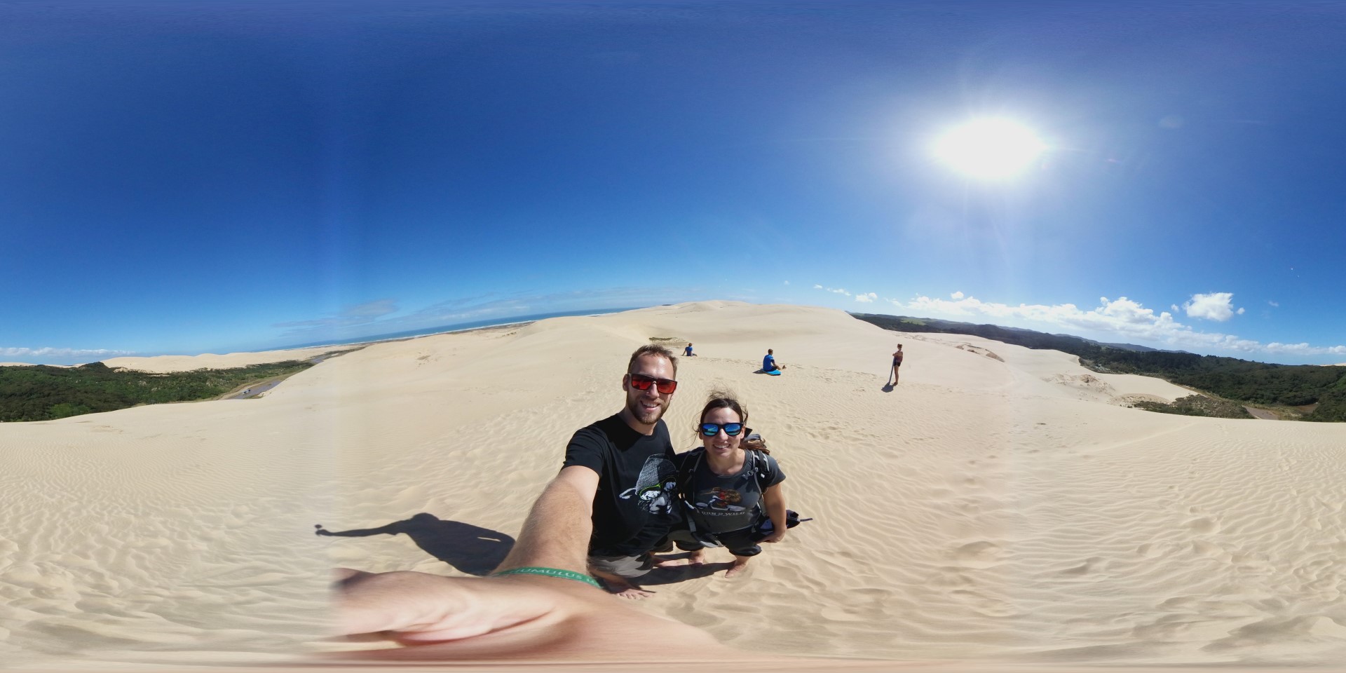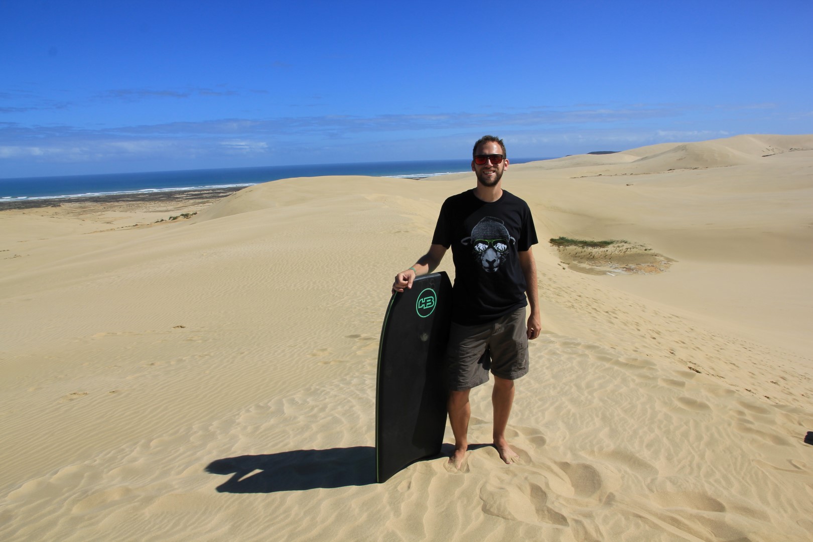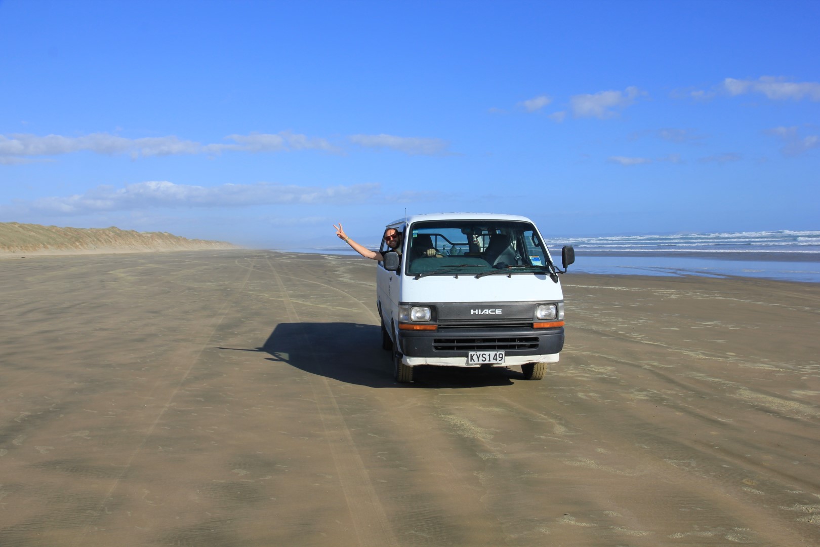 Südlich davon ist der Ninety Mile Beach, eine etwa 90km lange “Strand-Autobahn” an der Westküste. Wenn nicht gerade Flut ist, fahren die Leute mit ihren 4WD Autos drauf und rasen den Strand entlang. Zum Baden ist das Meer eh zu wild. Ein Warnschild besagte, dass schon viele Leute ihre Autos in den Fluten verloren hätten. Lukas hat es sich trotzdem nicht nehmen lassen, ein 15km langes Stück mit unserem Van zu fahren. Laut Campermate ist das Stück für 2WD Autos ok, aber es war trotzdem ein Abenteuer auf dem harten Sand zu fahren und kleine Flüsse zu durchqueren. Die Frage ist nur, warum die Neuseeländer den nur 55 Meilen langen Strand ’90 Mile Beach’ nennen 🙂